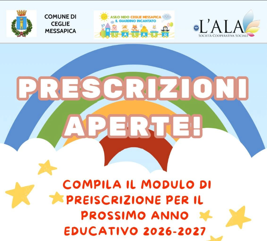 Il Comune di Ceglie Messapica informa la cittadinanza che sono aperte le preiscrizioni per l’anno educativo 2026/2027 presso l’Asilo Nido Comunale “Il Giardino Incantato”, sito in via Bellanova snc.