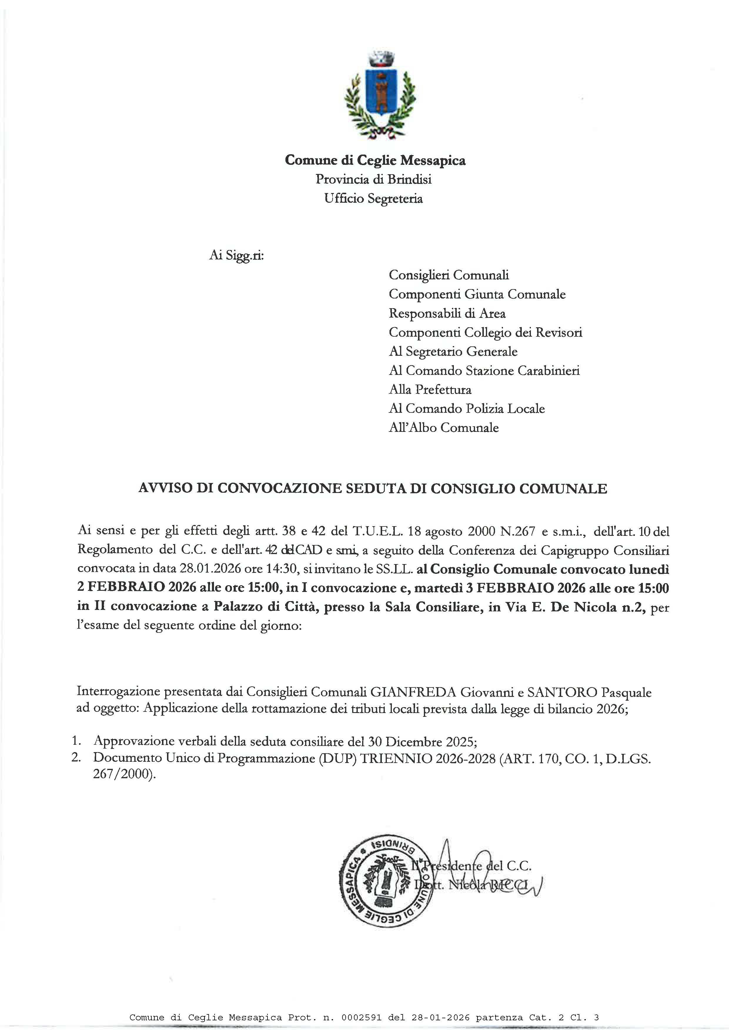 Il Consiglio è convocato lunedì 2 febbraio 2006 alle 15.00, in 1a convocazione, e il 3 febbraio 2026 alle 15.00, in 2a convocazione, presso il Palazzo di Città.
